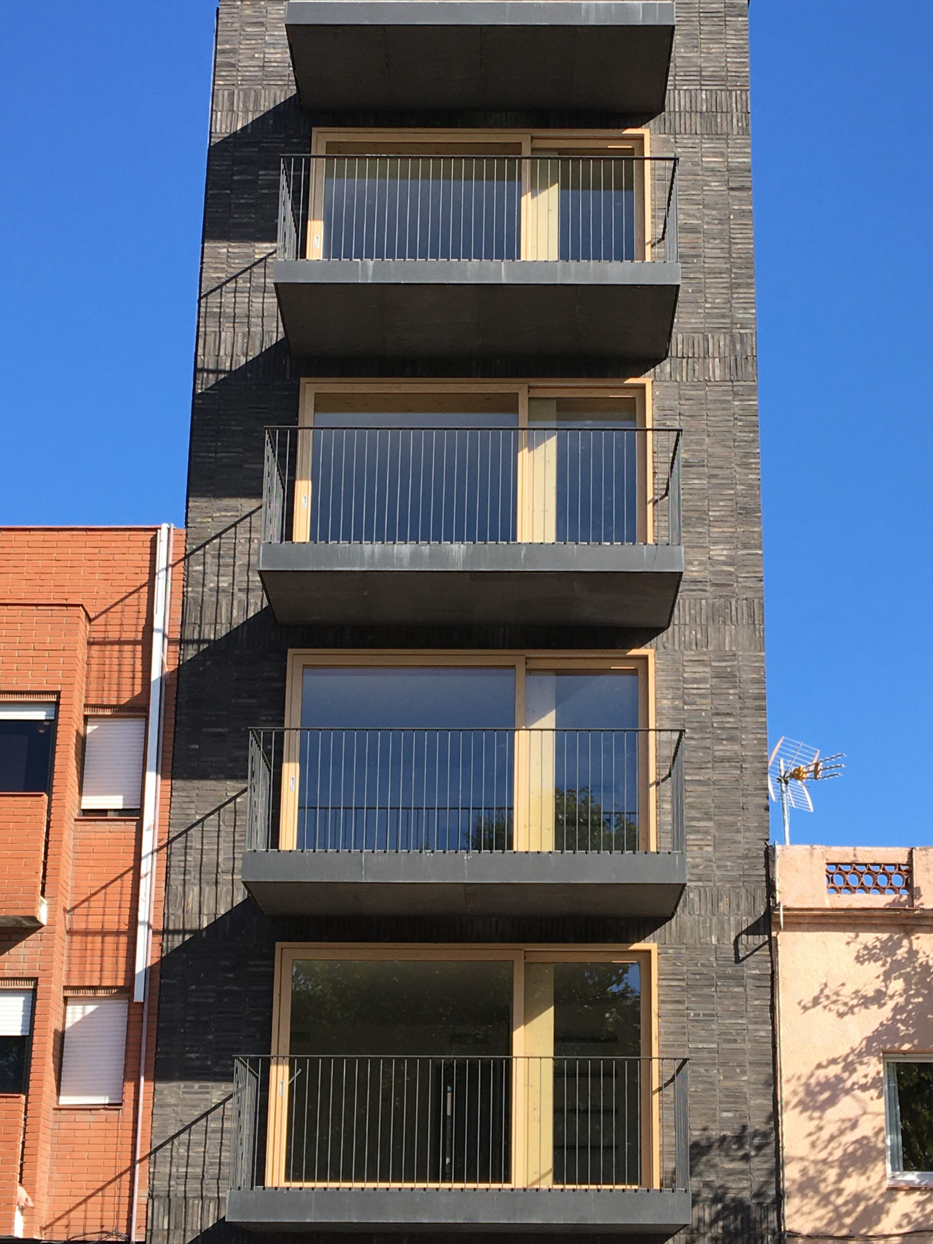 Aquest edifici modern de quatre plantes combina la sobrietat de l’obra vista en to gris fosc amb la calidesa de la fusta natural. A la façana principal s’hi van instal·lar amplies balconeres corredisses de fusta de pi flandes en color natural, que aporten lluminositat, textura i un toc distintiu al conjunt.