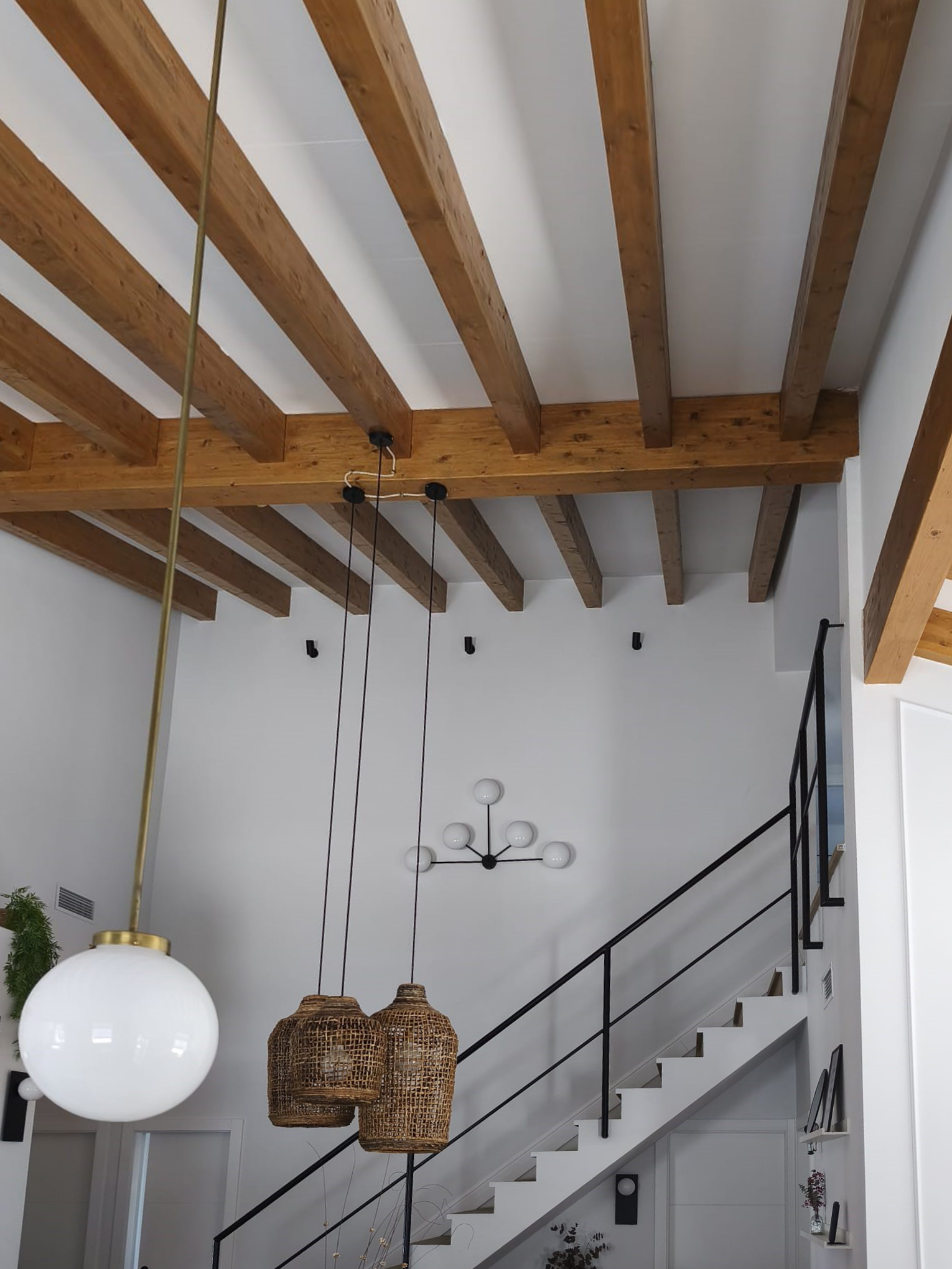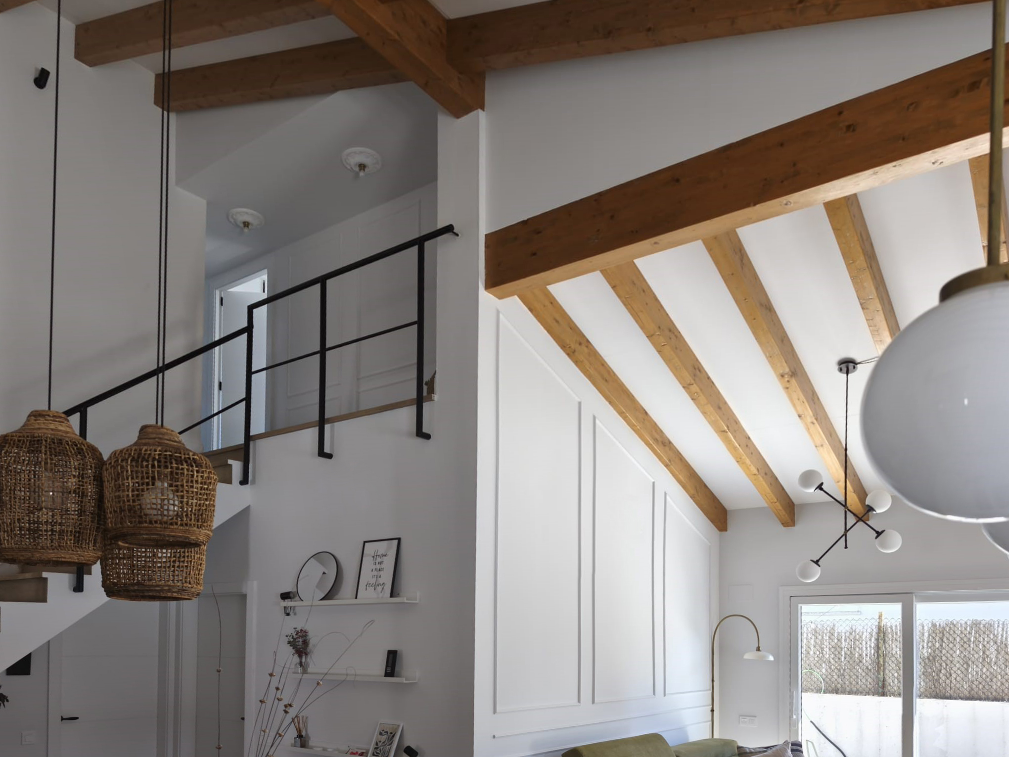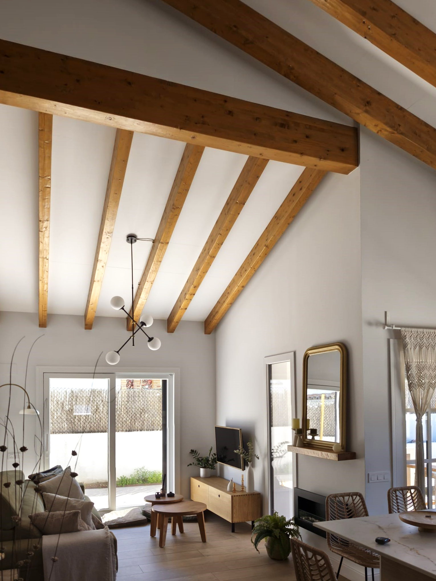 En este proyecto hemos ejecutado una cubierta de madera con vigas de abeto natural aserradas, que aportan un acabado cálido y auténtico tanto en el interior como en el exterior de la vivienda.